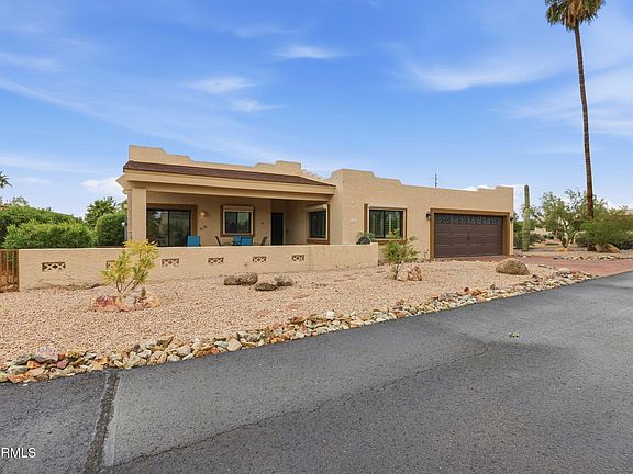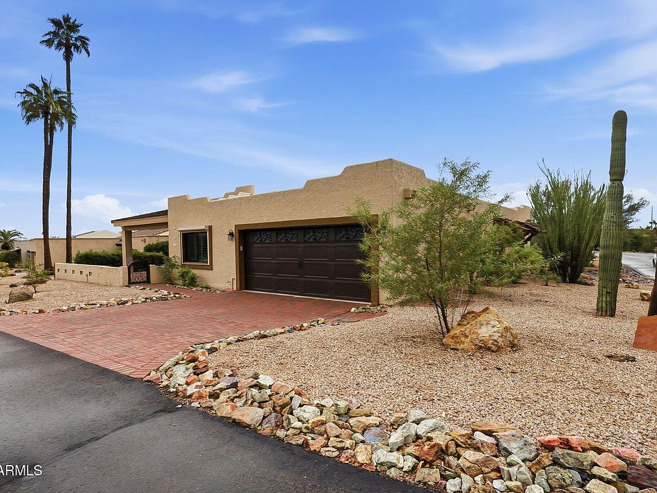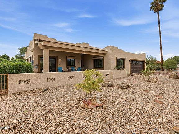Turnkey sale, all furniture and accessories convey! This upscale 3 bed, 3 bath home with a split plan Mother-in-Law Suite sits on a desirable corner lot in the 55+ Rio Verde Golf Community and has many recent upgrades! Gorgeous desert landscaping and a custom wrought iron door welcome you into a bright, elegant interior featuring stylish shutters, exquisite tile flooring, and a cozy fireplace. The gourmet kitchen boasts stainless steel appliances, granite counters, and abundant cabinetry. The new modern master bath offers dual sinks and a large walk-in tiled shower. Enjoy new patio doors, serene outdoor spaces with courtyard mountain views and an intimate backyard fire pit with lots of privacy. Move-in ready. Enjoy Rio Verde's golf, dining, fitness, and resort amenities! Welcome home!