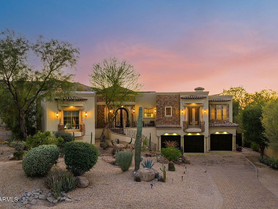Wood beamsOpen living spacesFull basementInterior elevatorArizona sunsetsStone accentsMultiple patios
