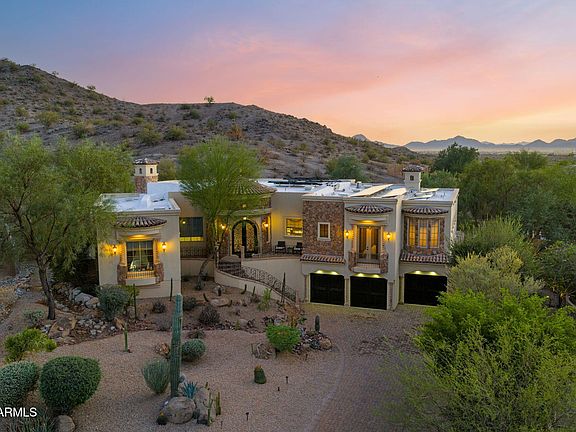 Tuscan charm meets desert living in this stunning 4 bed, 4.5 bath mountainside villa in the heart of the West Valley. Designed with timeless character, the home features stone accents, wood beams, & graceful arches throughout. Enjoy panoramic views & Arizona sunsets from multiple patios, perfect for entertaining or relaxing. The gourmet kitchen & open living spaces flow seamlessly, creating warmth and elegance at every turn. Rare for Arizona, this home includes a full basement with its own bathroom — ideal for a guest suite, game room, or private retreat. An interior elevator connects all levels, combining convenience with luxury. Located in the coveted Estrella Mountain community, where residents enjoy championship golf, resort-style pools, a yacht club, & more — true luxury living.