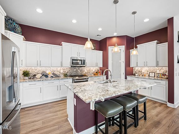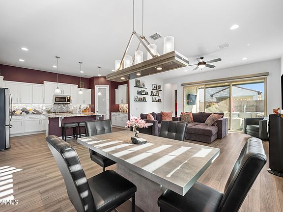Welcome to your Dream home in Surprise! This stunning 4-bedroom + den/office , 3 bath home by Woodside Homes offers 2387 sq .ft. of living space designed w/both elegance and functionality in mind. There is a 3 -car garage on a 6063 sq. ft. corner lot and Many upgrades! Notice the 9+ ft. coffered ceilings, and extra-wide hallways. A wall of windows in the great room fills the home w/ natural light and flows seamlessly to the outdoor covered patio w/ paved seating areas EZ care lawn & relaxing Hot Tub - perfect for year-round AZ living. Heart of the home is the chef's kitchen w/custom cabinetry, granite counters, custom backsplash, island, walk-in pantry. The primary suite with bay window bump-out and a gorgeous custom walk-in shower ! Den/office w/custom doors ..Welcome!