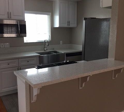 Beautiful two bedroom two bath apartment is very large and remodeling just completed. The entire unit is all new. All rooms are very large. Starting with the wood floors, baseboards, all new quality stainless appliances including stove, refrigerator, dishwasher, microwave and a stainless farmhouse sink, new quartz countertops and cabinets. Two all new beautiful baths including one with a walk-in shower with barn-door style glass enclosures and the other a full bath with tub and barn-door style glass enclosure. All tiled shower walls and floors, new fixtures, new cabinetry wit quartz tops, too. Huge closets in both bedrooms, armoire for linens, new windows, new 2" wood blinds. Huge private deck for outdoor bbq's, gardening or enjoying a glass of wine and watching the sunset. Grounds are full of mature beautiful pine trees. Small complex of only 5 units, laundry on site AND a one car garage, too, is included with this unit. Close to many major SoCal freeways and all the Long Beach has to offer.