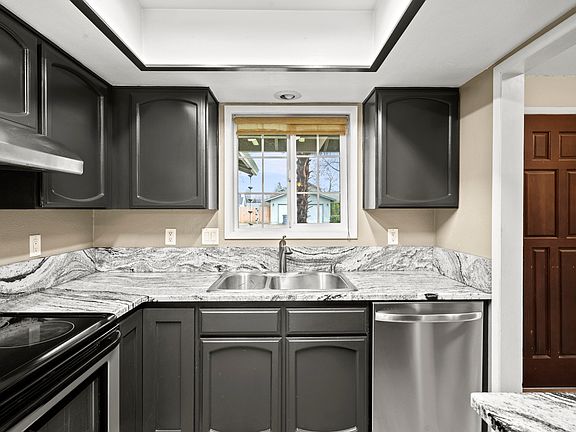 A three-bedroom, two-bathroom home, offering approximately 1,100 square feet of inviting space. The interior features a spacious living room with a cozy fireplace, a kitchen with granite counters, and a dining area for entertaining. Generous bedrooms and bathrooms provide comfort, while the large backyard boasts a spacious deck and large lawn for outdoor relaxation and entertaining. Notably, the master shower is brand new and remodeled, adding a touch of luxury to your daily routine. The property includes a designated area for small RV parking and a garage with a built in workbench and storage.