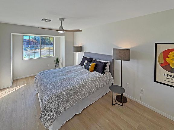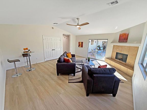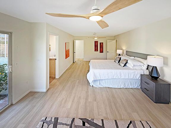 Discover a beautiful home inside Desert Park Estates subdivision. This single-story house offers approximately 1,999 sq ft of living space on a generous 10,454 sq ft lot. The interior has been modernized with luxury vinyl plank flooring, new lighting fixtures, ceiling fans, and recessed lights. Walls are painted in ''White Dove,'' while the exterior features ''Swiss Coffee,'' and the interior trim is finished in ''Chantilly Lace,'' creating a clean and sophisticated appearance.The primary suite is larger than usual and includes a spacious walk-in closet, a tile-lined shower, and a separate soaking tub, offering a true private retreat. On the other wing of the home, there's a versatile family room with a fireplace and sliding door access to the pool, ideal for relaxation or entertaining. Additionally, a conveniently located laundry closet near this space adds functionality.Outside, the property features RV parking through a side gate, along with a long driveway for extra parking. The backyard provides stunning views of San Jacinto Mountain from the pool area, making it a perfect desert backdrop for your oasis. With fee-simple land and no HOA, you enjoy ownership freedom and an excellent location just minutes from the airport and downtown Palm Springs.This home is a compelling value considering its size, updates, and lot size. It offers a great opportunity for those looking to add personal touches and create a desert-style retreat tailored to their taste.