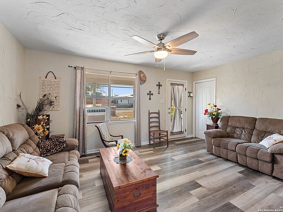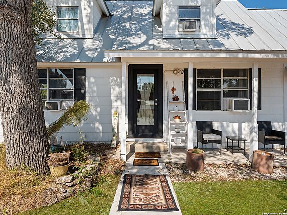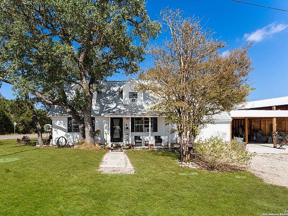 Experience Hill Country living at its finest in this charming 4-bedroom, 2.5-bath home on a level corner lot just minutes from Canyon Lake. This 1,700 sq ft residence showcases custom olive-gray wave textured walls, weathered wood-style laminate flooring, and a spacious kitchen with country white cabinetry and convenient corner shelving. The thoughtful floor plan includes a dedicated office space, while updated appliances, ceiling fans, and a covered porch enhance everyday comfort. Set on an 8,542 sq ft lot with mature trees where deer and peacocks roam freely, this unrestricted property offers carport parking, metal roof, territorial views, and the perfect blend of peaceful countryside living with easy access to recreational opportunities. Located on a paved county road with convenient routes to New Braunfels (30 minutes) and San Antonio (45 minutes via FM 306), this traditional Hill Country home delivers both serenity and convenience without HOA restrictions.