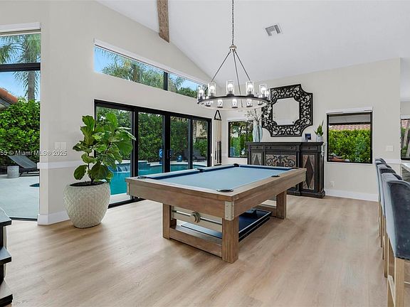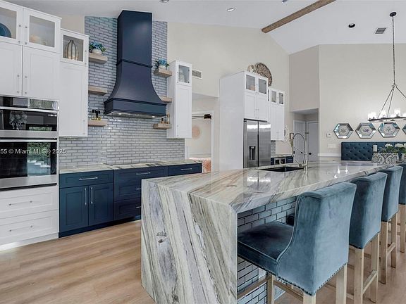 Stunningly renovated one-story 4/3 pool home with spacious open layout and abundant natural light—PERFECT for entertaining. Chef’s kitchen features an expansive island with seating, Brazilian quartz countertops with waterfall edges, accent tile backsplash, designer hood, custom cabinetry, 36" induction cooktop, wall oven, microwave, and dedicated beverage station with wine fridge. High-end finishes throughout with 20 mil luxury vinyl flooring, upgraded millwork, and decorative ceiling beams for a sleek modern feel. Low-E impact windows and doors and zebra blinds throughout. Enjoy the outdoor space with a refinished pool, white marble deck, artificial turf, and lush designed landscaping. Move-in ready w/ $230K+ in upgrades! Conveniently located near highway, shops, restaurants & schools.