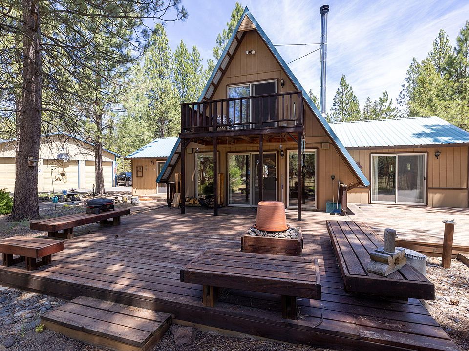 Discover this charming home located in the desirable private community of Wagon Trail Ranch. This custom-built A-frame features 3 beds and 2 baths, 1,976 square feet, and beautiful Blue and Buggy pine accents. The kitchen includes an eating bar and opens into the living room, which has two sliding glass doors that provide ample natural lighting. The living room also has a woodstove to keep you cozy in the winter. On the lower level, you'll find two spacious bedrooms. The upper level has a loft-style bedroom with a balcony, as well as an additional room suitable for an office or art studio. This room also has an extra loft area. Outside, enjoy a 1/2 wrap-around deck, ideal for relaxing. Also, a large 1,728-square-foot garage/shop w/ two large carports on either side, along with an insulated and heated workshop. Community amenities feature a heated swimming pool, a clubhouse, and a sauna. There's also easy access to the Little Deschutes River, perfect for rafting, kayaking, and fishing.