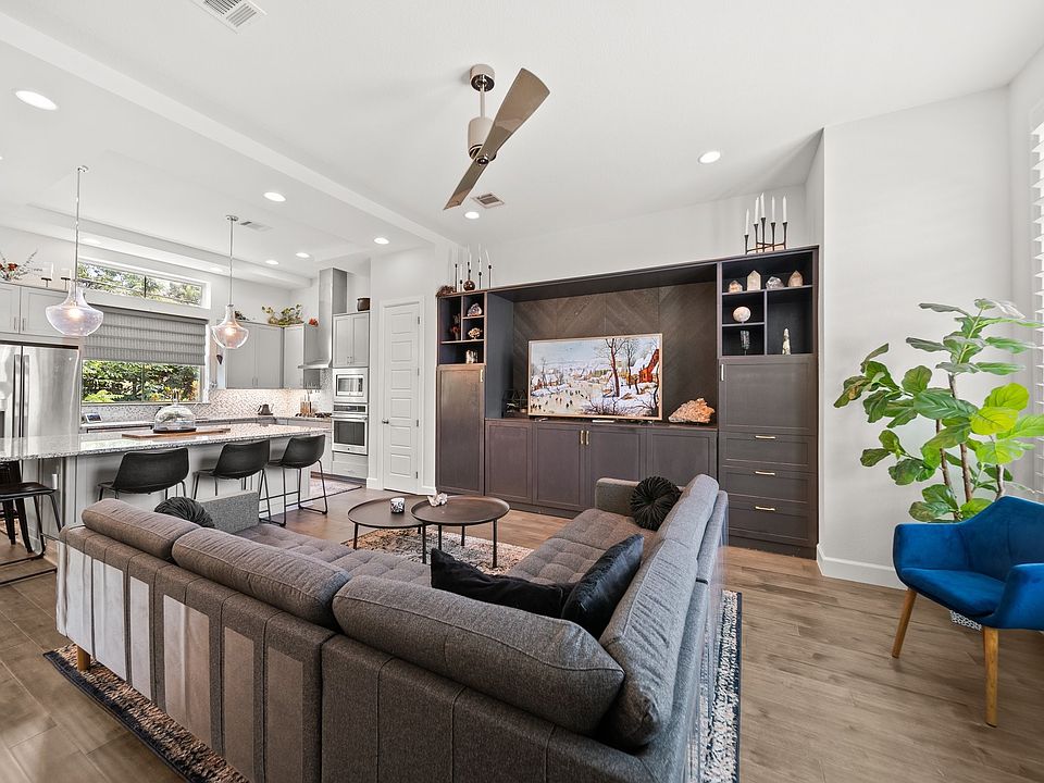The chef-inspired kitchen is a standout, featuring a generous island, GE stainless steel appliances, a gas cooktop, and a roomy dining area, ideal for both casual meals and entertaining. The living space is enhanced with custom built-in cabinetry, offering fa generous amount of storage and charm. Each bedroom includes a private ensuite, providing ultimate comfort for guests. Primary retreat impresses with two spacious walk-in closets and a spa-like bathroom. Outside, enjoy a low-maintenance yard complete with turf and a sleek decked patio perfect for unwinding or hosting.