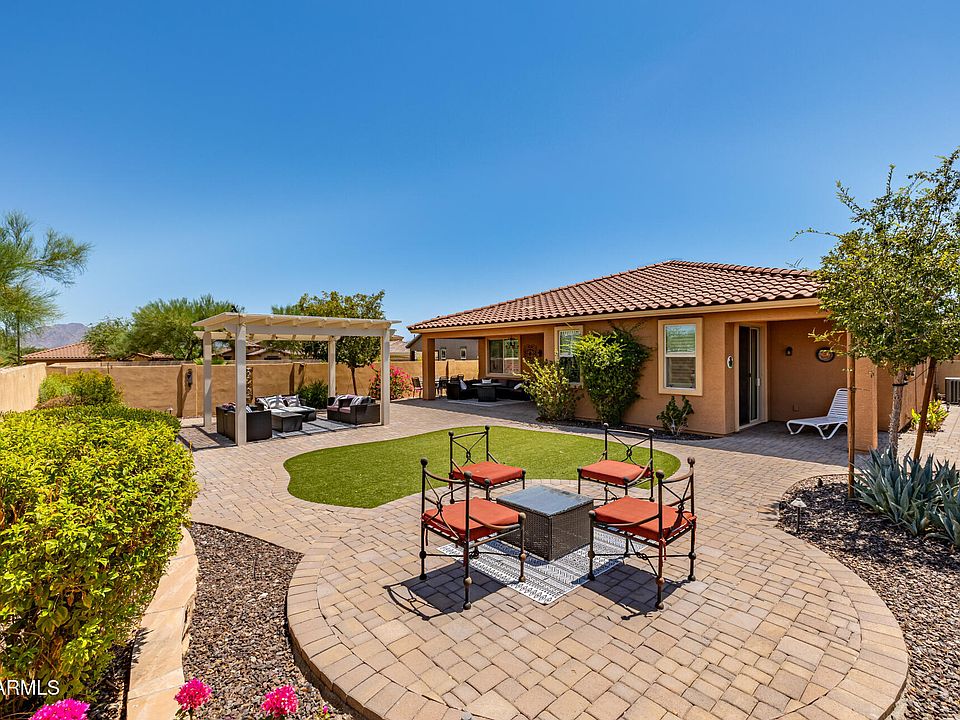 Amazing sunsets to be enjoyed in the backyard! PAID OFF SOLAR, energy-efficient home is ready for you to move in! Appealing interior boasts a blend of wood-look & tile flooring, neutral paint, archways, and plantation shutters. You'll LOVE the living room, formal dining room, and the harmonious great room adorned with pre-wired surround sound. Well-appointed kitchen features recessed & pendant lighting, a pantry, tile backsplash, gleaming stainless steel appliances, granite counters, and a prep island with a breakfast bar. Romantic primary retreat offers direct outdoor access, an ensuite with two vanities, a soaking tub, and a walk-in closet. Outside, you'll find a spacious backyard, complete with a covered patio and pergola, ideal for enjoying serene mornings or weekend gatherings. PLUS! Excellent Community amenities await. Don't miss!