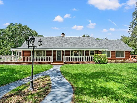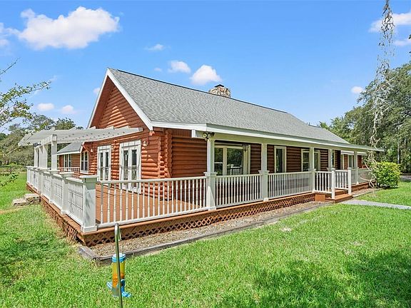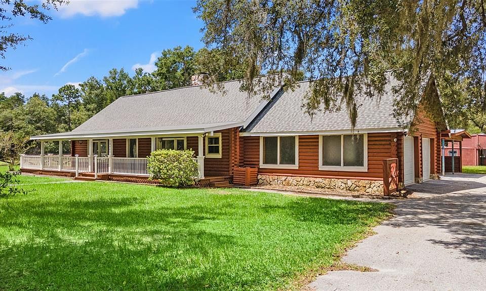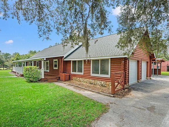 Welcome to Your Private Country Estate Discover this magnificent 2,404 sq. ft. log ranch home with 3 bedrooms, 2.5 baths, attached 2-car garage, 2 stall carport, and a caged pool, all set on 5 fully fenced acres. Perfectly blending rustic charm with modern comfort, this property offers both seclusion and convenience. The acreage is thoughtfully designed with four separate gated paddocks, featuring both open pasture and shaded timber. An adjoining 2.5-acre rectangular parcel provides flexibility—use it for additional pasture, or sell it as an investment. At the end of a quiet, secluded road, this home offers true privacy—no neighbors in sight. Equestrian and hobby enthusiasts will appreciate the four-stall barn with electricity and its own well. Whether refurbished for horses or reimagined and rebuilt as a pole barn, workshop, or guest house, the possibilities are endless. Step inside to a warm and inviting lodge-style family room, centered around a dramatic 20-foot, floor-to-vaulted ceiling stone fireplace. The updated kitchen features stone countertops, a hooded island cooktop, and stainless steel appliances, including a 2023 smart touch-screen refrigerator and a built-in double oven. Every window offers a view—whether it’s the Spanish moss-draped oaks in the front yard, the peaceful fenced pasture, or the sparkling pool just outside the kitchen, master suite, and second bedroom. While this home feels like a private retreat, it’s only minutes from shopping, groceries, and the Suncoast Parkway—just 40 minutes to Tampa International Airport and 50 minutes to downtown Tampa. Only 1/2 mile to the paved 54 mile Suncoast Trail for biking and walking! No HOA. No flood zone. Recent updates include: 2025: New garage doors, wraparound porch floorboards & stain, French doors, carpet in bedrooms 2024: Pool pump 2023: Double oven, refrigerator, AC unit 2022: Roof 2020: AC unit This rare property offers the perfect canvas to create your own private country estate—complete with privacy, acreage, and the modern amenities of a rustic resort lodge.