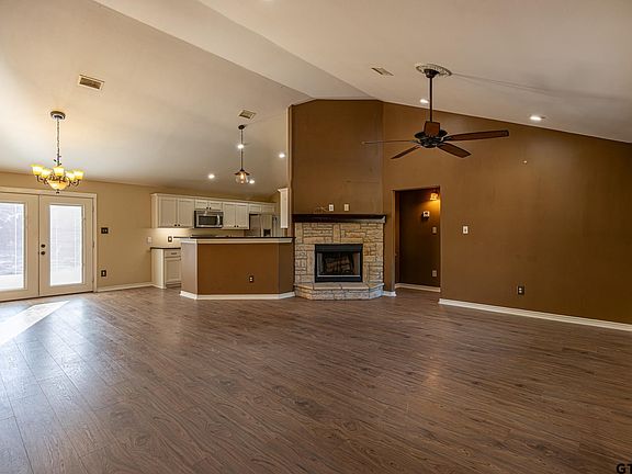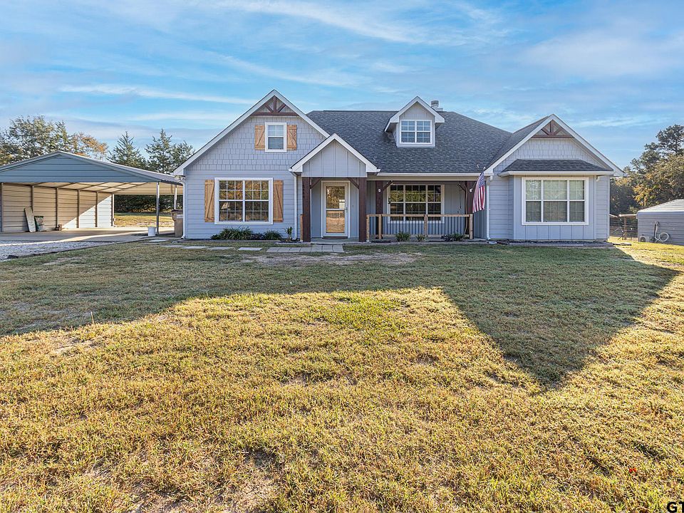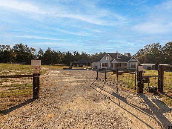 Come see this charming secluded country style home with 3 bedroom 2 baths and large well lit carport with RV hookup all nestled on nearly 4 acres in the countryside of Arp, TX! This property offers a perfect blend of privacy and nature complete with a gated entrance. Step inside to find a spacious living area featuring a stone fireplace, perfect for cozy evenings with family or friends. The open floor plan provides ample space for entertaining with French doors opening up to the back patio area. The kitchen has modern stainless steel appliances, beautiful granite countertops, a nice sized pantry and plenty of counter space. Split bedroom arrangement with primary bedroom featuring an ensuite bath, dual sinks, garden tub, separate shower and walk-in closet. Outside, the expansive acreage provides room for gardening, outdoor activities, or simply enjoying the tranquility of rural living. The main gate has a new Champion Fence heavy electric gate opener with battery backup and keys and keypad. Separate dog/chicken fencing within main fencing, extra out buildings which include covered parking and shop/storage shed, insulated with mini split for heat/cooling with lights and wall plug added. Escape the city life and make this country getaway yours today!