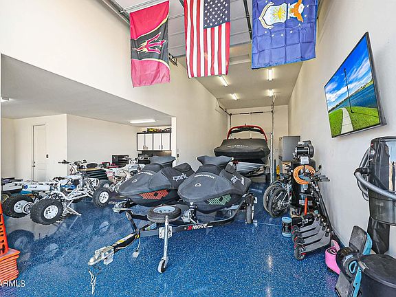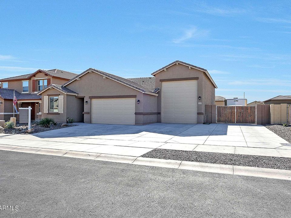 Now this is what you call a SUPER RV Garage!! You have to see it! 16 Ft tall 14 1/2 ft wide and 47 1/2 ft long! All fully insulated and a plethora of attached garage cabinets with a work bench! 10x10 Roll up door in the rear of the RV garage going out to the back yard. Enough for all of the toys! Oh is that not enough well you also have the 3 car tandem garage with a 4 foot extension and an 8ft Garage door. Yes there is more! Extra concrete slab leading to your 12ft RV gate with more parking! Check out the gorgeous Epoxy floors in the garage as well. If you need an ex large garage this is the home for you. This stunning home built in 2020 doesn't disappoint! Wait until you see the amazing split- floor plan with upgraded 8ft interior doors throughout! As you walk into this beautiful spotless home you will notice the attractive low maintenance woodgrain tile flooring and the recently upgraded recessed lighting throughout the home making the home look striking! There are 2 bedrooms ,a full bath and a nice den with upgraded double doors as you walk in. The kitchen is stunning with elegant upgraded 42inch cabinets, Granite counter tops, stainless steel appliances, huge island with a large deep undermount stainless steel sink and a generously sized walk in pantry. All of this opens up to your large dining and Living room area. The master bedroom is at the back of the home and is very spacious with upgraded recessed lighting as well. Master bath has double sinks, upgraded cabinets, separate Soaker tub and shower, private toilet room and a large roomy walk in closet. Don't forget to check out the backyard! The upgraded extended patio featuring premium travertine tile leading out to the professionally landscaped yard. Lush green grass and lots of extra room for a pool etc. This home is on one of the two streets with the bigger lots offered by the builder as an upgrade. Lots of other upgrades in this home like cabinets in the Laundry room, 2 inch blinds on all windows, fully landscaped front and back on automated sprinklers and drip, raised block wall on east side of house for privacy, rv gate recently stained, block between rv gate and home redone and painted for better stability and ceiling fans in all rooms. The community is amazing with a Community Pool, splash pad, tennis and basketball courts, dog park, and lots of green belts and play structures throughout the community. The Loop 303 freeway is a quick 5 minute drive away to get to any part of the valley. You will be impressed with this home and neighborhood! Come see it today!
