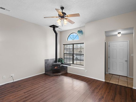 Welcome to this charming home in the heart of Rio Rancho! This beautiful 2 bedroom, 1 bath home offers an inviting blend of comfort and a great outdoor living space with year round green (synthetic) grass by Syn Lawn. Enjoy the heat of the wood stove on cold nights, vaulted ceilings help enhance the spaciousness of the living room, making it a great space for relaxing and entertaining. Updates include stainless steel appliances, wood laminate flooring and tile, fresh paint inside. Washer and dryer included. The 1 car garage is attached to the kitchen perfect for bringing in groceries. Do not pass this one up.
