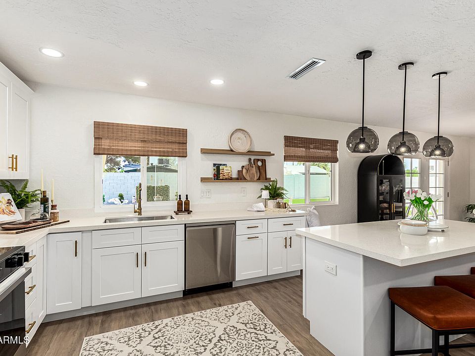 Discover this exquisite, beautifully remodeled 3-bed, 2-bath brick home in the heart of Tempe, with no HOA!! Experience the spacious, open floor plan, elegant recessed lighting, and stylish plank tile flooring. Cozy up by the fireplace or entertain in the chef's upgraded kitchen featuring luxurious granite counters, wide shaker cabinets with crown molding, high-end SS appliances, walk-in pantry, and a granit island with breakfast bar—ideal for family gatherings. A stunning, serving window connects the kitchen to the outdoor space, perfect for effortless alfresco dining. Large backyard boasts a covered patio, artificial turf, and a sparkling pool for cooling off on hot days. Minutes from ASU, Kiwanis Park, lake,and recreation center, shopping & dinning.