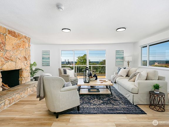 Mid-Century Modern in North Tacoma's Coveted Skyline Neighborhood! Fully updated, turn-key home w/narrows bridge, mountain & sound views throughout! Upstairs you will find the open living area, fireplace w/VIEWS + private patio! The living area is open to the dining area/kitchen with luxury quartz countertops /waterfall kitchen island for gathering. Stainless steel appliances + soft close shaker cabinets! Spacious primary bedroom upstairs w/VIEWS + walk-through closet & en-suite bathroom. Additional bathroom and bedroom upstairs! Downstairs you will find an additional spacious bedroom with fireplace plus 4th bedroom and 3/4 bath! NEW LVP flooring/paint/fixtures! You will LOVE the fully fenced, perfectly manicured yard. 1/4 ACRE Lot. NO HOA