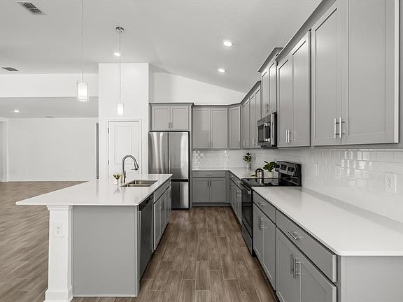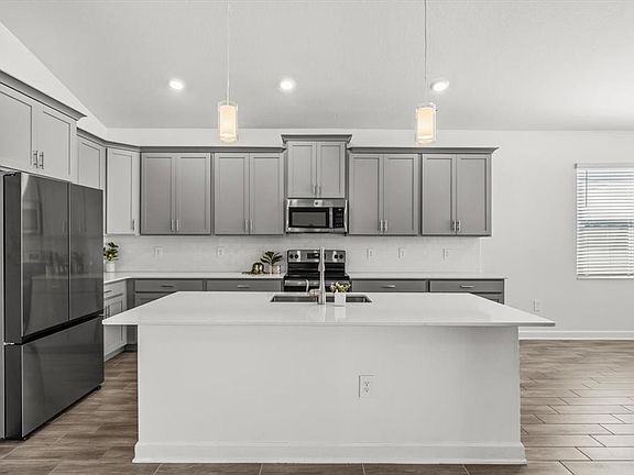 Step inside a home brimming with light, space, and potential—a 4-bedroom, 3-bath, 2,621 SF residence in the highly regarded Trinity Lakes Signature community, thoughtfully designed to integrate timeless style with everyday livability. Sunlight pours through expansive windows, highlighting an open, flowing floor plan that’s ready to adapt to your vision—whether it’s lively gatherings, peaceful mornings, or something in between. The chef-inspired kitchen shines with a Samsung Bespoke stainless-steel refrigerator, sleek lighting, generous prep space, and bar seating with included stools, creating a natural heart of the home. The primary suite offers quiet refinement with dual walk-in closets, blackout blinds, a spacious walk-in shower, and elegant finishes, while the Jack-and-Jill secondary bedrooms deliver versatility and privacy. The epoxy-finished 3-car garage is a showpiece of organization, complete with hanging storage, multiple cabinets, attic flooring with stairs, and a second refrigerator—every detail designed for effortless living. Step beyond the walls to a screened lanai and paved outdoor platforms, perfect for al fresco dinners, quiet coffee breaks, or sunset reflections framed by a vinyl privacy fence. Thoughtful enhancements extend throughout: Govee architectural lighting, full-home gutters, front and rear screened porches, flower bed wall, new sod, custom blinds, and ceiling fans with remotes in every room. This residence is equipped with modern intelligence—Level Lock smart deadbolt, Ring camera, built-in termite protection, flood detectors, and a comprehensive water softener and triple filtration system. Enjoy resort-style amenities including a sparkling community pool, fitness center, and clubhouse, all surrounded by tranquil views and tree-lined scenery that creates a lasting sense of calm and connection. Ideally located near Groveland’s Lake David Park and Cherry Lake Park, offering walking trails, playgrounds, kayaking, and community events. Everyday conveniences are just minutes away, including Groveland’s new Starbucks, a tire shop, dentist, and car wash, making errands effortless. With the Florida Turnpike nearby and Clermont’s vibrant shopping, dining, and entertainment within easy reach, this vacant home is ready for its next chapter—a blank canvas waiting to reflect your own style, rhythm, and life. NOTE: Current VA Loan being offered Assumable to fellow Veterans!