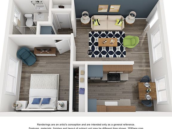 Exterior upgrades include a midnight blue color scheme, neon green garage doors, pops of pink, and lush landscaping. Enjoy the convenience of two on-site laundry rooms.