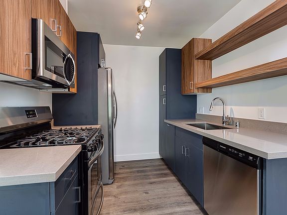 The kitchen has been finished with custom matte blue cabinetry, walnut wood grain cabinetry, and floating shelves. Appliances include a stove, refrigerator, microwave, and dishwasher.