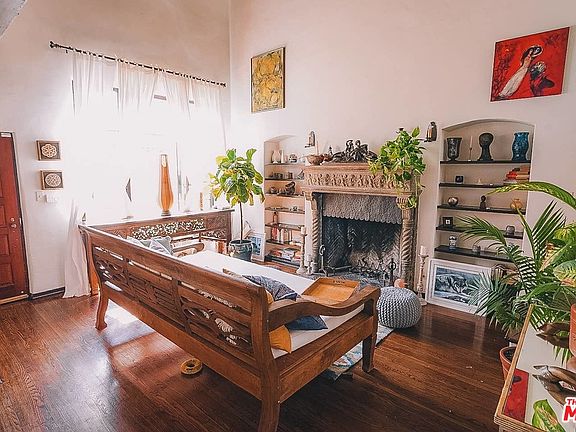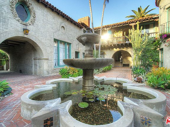 This gorgeous historic two-story Spanish-style townhouse is located in one of the six remaining Spanish revival courtyard buildings. The "El Cabrillo" was designed in the 1920's by Arthur & Nina Zwebell, and commissioned by Cecil B. Demille. Living room has soaring 20 ft ceilings and large engraved stone fireplace, formal dining room, kitchen and private back patio. Kitchen has granite counters, stainless steel Bosch appliances. Central a/c and heat, washer/dryer inside the unit. Walking distance to the Hollywood Bowl, W Hotel Hollywood, Trader Joe's and several theaters, restaurants, clubs and more. On the National Historical Register and is preserved under the Mills Act, which allows significant tax benefits to the owner. One-car garage parking. Seller selects services.