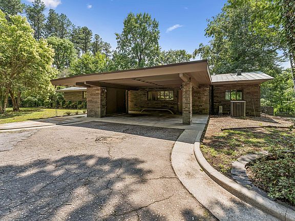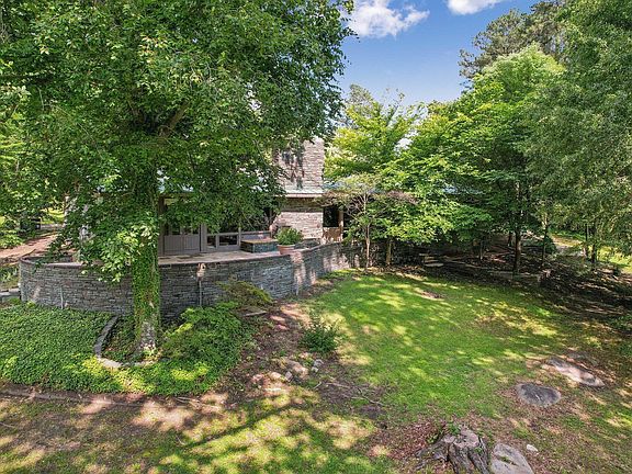A rare, classic example of early 50's Modern MidCentury Architecture: Designed by George Foster Harrell in 1952, the house sits on almost 3 pristine acres, and boasts more than 260 feet of waterfront frontage on the Tar River. The home is an authentic homage to Modernism: the language of horizontal glass, wide overhangs, Cypress and Oak wood paneling throughout, and ceiling beams are a few of the elements incorporated in the design. The tightly stacked Georgia stone exterior grounds the house within its setting, resembling a natural rock outcropping. The interior layout is anchored by two double sided massive stone fireplaces between the bedrooms, as well as the living room and exterior patio. The Primary Bedroom and Living Area feature vaulted ceilings with integrated cove lighting. A wall to wall glass sliding door opens the Living Room to the Sun Room, thereby merging the two spaces into one. All the major living spaces are oriented to the Tar River. The salt water heated pool, with it's own bathroom and storage area, and the sweeping curved stone patio offer more ways to integrate the beautiful setting into daily life. The property is documented in the NC Modernist Archives.