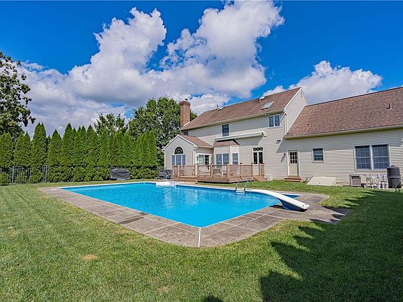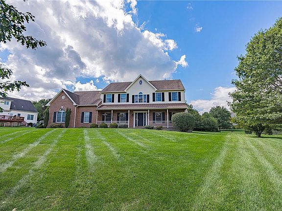 Saucon Valley Stunner! A traditional style, cul de sac home set on a gentle hill greets you with manicured landscape, timeless brick and a sweeping front porch, This 4 bedroom, 2.5 bath colonial blends every buyer's favorite features with modern day function. Welcome visitors in the grand foyer with focal staircase flanked by a formal living room that has glass paned french doors and formal dining room with chair rail and crown molding, Follow the hardwood floors to the recently remodeled and beautifully appointed black and white kitchen, generous eating area and vaulted family room with gas fireplace. Finishing out the first floor is the private office, laundry, half bath and garage access. Upstairs there are 4 spacious bedrooms, all with hardwood flooring, large closets and ceiling fans. The expansive primary suite has 2 huge walk in closets and a bonus room currently used as home gym. A finished basement where anything goes, its the perfect space for family movie night and gaming or can be a more sophisticated lounging area. There are also 2 large storage rooms. The backyard has a large composite deck with retractable awning, perfectly placed in ground pool, 9' in depth, a hot tub and shed all surrounded by mature arborvitae which creates an extremely private haven. Side entrance 2 car garage, large driveway with basketball hoop and Saucon Valley school district. Close to Hellertown main st. shops and restaurants, Rail Trail, Promenade Shops and Lehigh University.