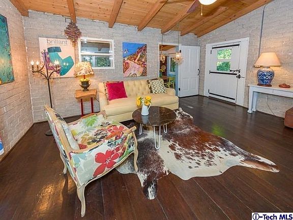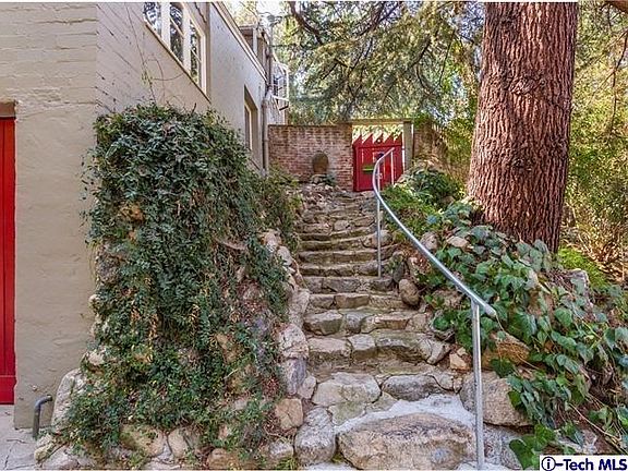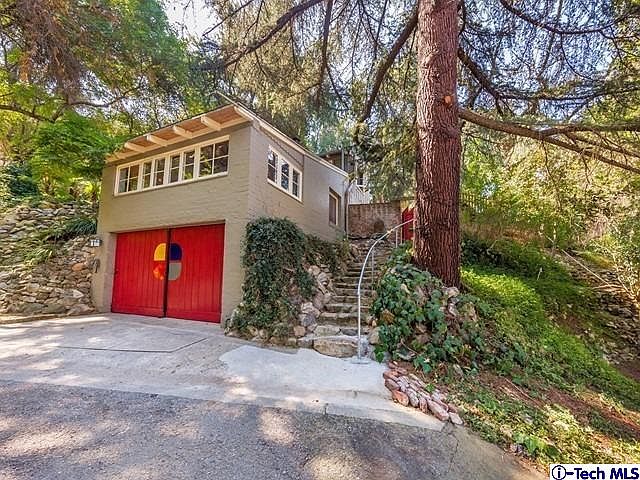 This 20's vintage Bungalow is nestled high above an alcove in the hillside. Its rustic vibe is enhanced by the lush wooded terrain and rock formations that surround it. Inside you are welcomed with elements of yester year. The wood beamed ceiling, natural wood floors and fireplace exude warmth. The eye catching sun room can inspire artistic talents or just pure relaxation. The open kitchen features an island, like new original cabinetry and exquisite transom windows that are rarely seen. The separate laundry room off the kitchen includes a large handy bonus space. The hardy natural wooded stairway leads to the upstairs bedrooms. Each bedroom has a uniqueness of its own including some bead board walls, beamed ceilings, French windows and ample closets. There is also an additional room waiting for your creativity. Step outside to a lush private area and enjoy eating under a vine covered pergola. A perfect setting for al fresco dining. Across the park like grounds is a timeless separate cottage. It has a living area with a fireplace, kitchen, bath and its own patio. It is ready to serve as your office, music studio, guest quarters or a terrific rental unit. There is direct access to the house from the garage. This property gives you a feel of rural living at its best!