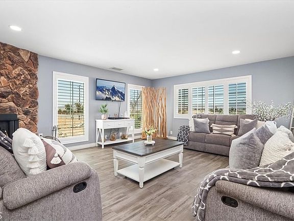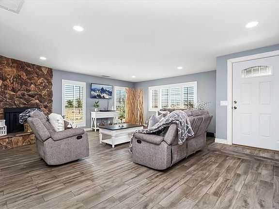 Welcome to this charming horse property that offers 3 bedrooms, 2 baths situated on a spacious corner lot. The inviting living room features a stunning rock fireplace, perfect for cozy evenings. Throughout the home, you'll find sleek laminate flooring and modern recessed lighting . The property boasts an attached 2 car garage for convenience. This home has over an acre lot and has 6 horse stables and horse arena, making this a unique find.