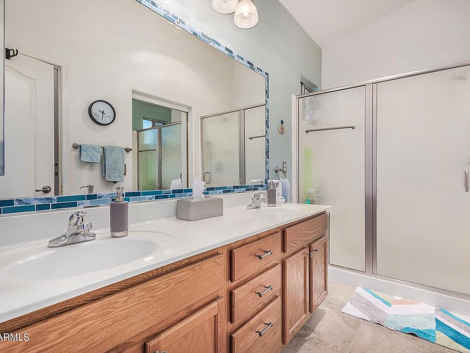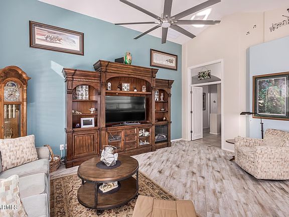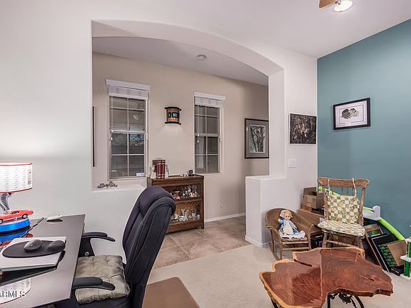 This home is unfurnished. This lovely home in Arizona Traditions will surprise you when you enter the tiled foyer with its updated lighting. The living room, kitchen, and dining are all open concept. The entire area has all updated floor tiles, granite counters, cathedral ceilings, new light fixtures, new ceiling fan and an extended island for breakfast or happy hour. The appliances are stainless and a gas stove and vent are new. The kitchen includes a pantry. The laundry room, with a large laundry sink and extra cabinet space, leads out to the 2 car garage with plenty of built in cabinets. The rear patio is covered the length of the house and has 3 new southern style lights/fans. There are roll down blinds. Enjoy your morning coffee along with amazing wildlife with song birds roadrunners and families of quail and even hot air balloons, you will love the nature the oversized back yard provides. Happy hour will bring gorgeous sunsets and all the while you have a view of the White Tank mountains. The yard also has 2 fruit trees. The huge master suite has newer carpet and extends to a large tiled bathroom with double sink vanity, private water closet, walk in large shower and walk-in closet. There is a second full bath with new sink and fixtures, an open concept office with room for a queen size sofa bed and then there is a nice sized second bedroom with a large closet at the end of the hallway. The home has a green space on its north side and the flood berm along the back side. There will never be buildings there. You will love this quiet location and nature lovers yard.