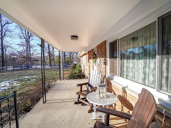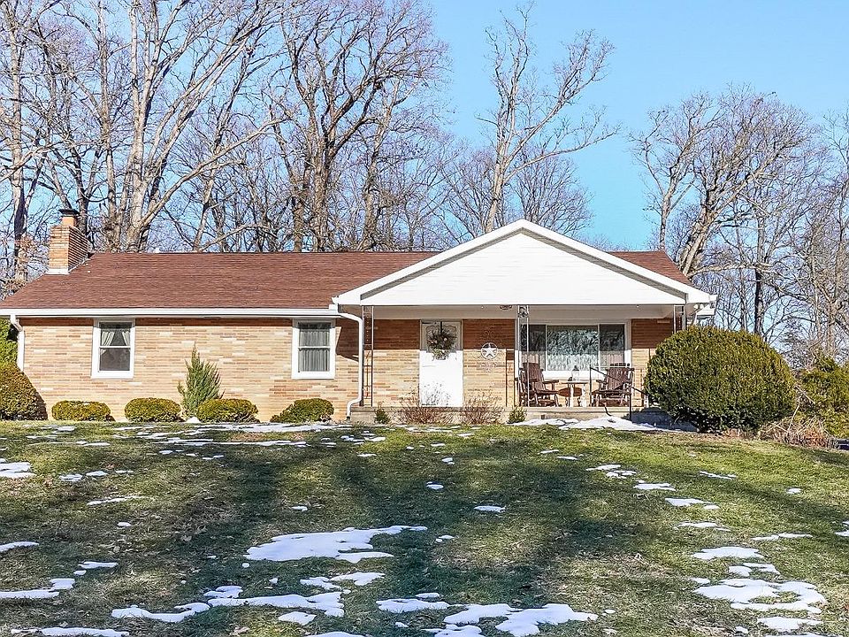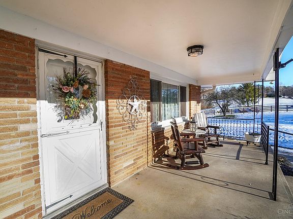 Freshly remodeled brick ranch with full basement sits on a gated 10.5 acres, minutes from I-71. This home and acreage is ideal for a rural lifestyle that can include farm animals, hunting, 4-wheelers, gardens or just having your own quiet space. 4 spacious bedrooms & 2 full updated baths - this home has been tastefully renovated from top to bottom. All new LVP flooring, stunning open eat-in kitchen w/ quartz island & counters. Off the kitchen is your 3 season room overlooking a spectacular wooded valley. Other features include: large 2 story barn with water/electric, fenced pastures, chicken coop, stocked pond, circle driveway, fenced yard. Nice trail system throughout. Other recent updates include - newly installed central HVAC, new windows, gutters, new Water Heater and much more. See attached feature & update list.