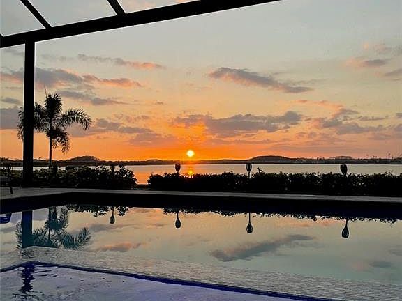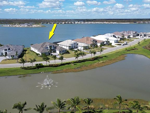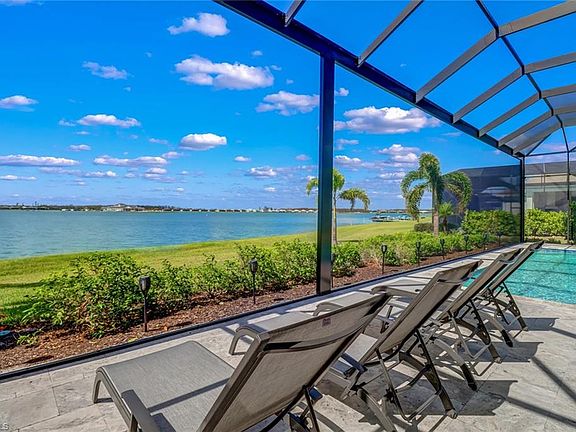 Luxurious 4,369 SF, 4-bed/5 bath Stock Development customized lakefront home with spectacular sunset views. The home features an 18x20 flex bed/bonus room, media room, formal dining, kitchen nook, & office providing flexible spaces & open living. Upgrades include a designer kitchen with double islands, custom built-in cabinets in the great room, office, dining room, bonus room & master closets; plantation shutters, motorized shades, custom drapery, iron front doors, high-end tile work, and unique ceiling designs. Entertain in your expansive panoramic, super screened-in lanai with a custom fireplace, an outdoor kitchen with an island, a large pool & oversized spa. An additional refrigerator in the laundry room, 2 insulated 2-car garages a whole-house Generac generator, and Tesla EV connector are also included. Spacious lot with lake views from the rear and pond views from the front! WildBlue has many amenities including 8 pickleball courts, 6 tennis courts, bocce, basketball, a fitness center, fitness classes, a lap pool, and a soon-to-come resort pool with a full-service restaurant and pool grille. WildBlue is located close to the airport and shopping. Come enjoy the sun and fun!