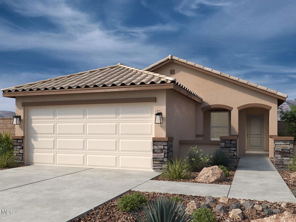 This single-story home offers an open floor plan with 9-ft. ceilings and a split-bedroom layout. The spacious great room provides ample living and dining space with sliding door access to a charming covered back patio. The kitchen includes a large breakfast bar, a walk-in pantry and extended upper cabinets for added storage. The primary suite, located at the back of the home for added privacy, offers a connecting bath with a 42-in. garden tub and shower, dual-sink vanity and a conveniently located linen closet. Additional highlights include a walk-in closet in the secondary bedroom, energy-efficient low-E windows, ceiling fan prewire in the great room and bedrooms and a Wi-Fi-enabled smart thermostat for added comfort and control.