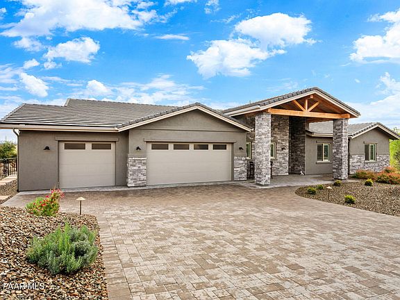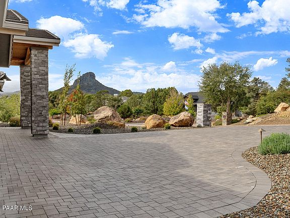Completed in late 2023, this beautifully crafted 2,608 sq ft single-level custom home in the coveted Enchanted Canyon community commands breathtaking views of Thumb Butte, P Mountain, the sparkling city lights of Prescott, and spectacular sunrises that light up the horizon each morning. Thoughtfully designed to blend modern craftsmanship with natural beauty, it's ideally located just minutes from downtown Prescott, Thumb Butte, and miles of scenic hiking trails--offering the perfect balance of serenity and convenience.Inside, the open-concept design connects the great room, dining area, and chef's kitchen--each space positioned to showcase the surrounding mountain scenery. The living area features a stacked-stone fireplace, recessed lighting, and sliding doors that open to the expansive covered patio, creating a seamless flow between indoor comfort and outdoor living.The chef's kitchen is both elegant and functional, featuring custom cabinetry, a striking waterfall quartz island, warm copper pendant lighting, a Wolf oven, and premium stainless appliances, with high-end finishes throughout.The primary suite offers a peaceful retreat with stunning views, a spacious walk-in shower, and a custom-built closet with drawers, shelving, and abundant storage. Additional highlights include a dedicated office with built-in cabinetry, designer guest baths with floor-to-ceiling natural stone and copper accents, and practical upgrades such as surround sound both inside and on the covered patio, a central vacuum system, and an owned water softener.Outdoor living is at its finest with a covered patio, outdoor kitchen, and fire table overlooking dramatic boulder formations and panoramic mountain views. The oversized 990 sq ft three-car garage includes epoxy flooring, built-in cabinetry, and a dedicated 240V electrical setup. With wiring and outlet already professionally installed, it's EV-ready, allowing for quick and easy installation of your electric-vehicle charging station.This is Enchanted Canyon living at its best -- a rare blend of modern design, mountain vistas, and exceptional craftsmanship in one unforgettable home.