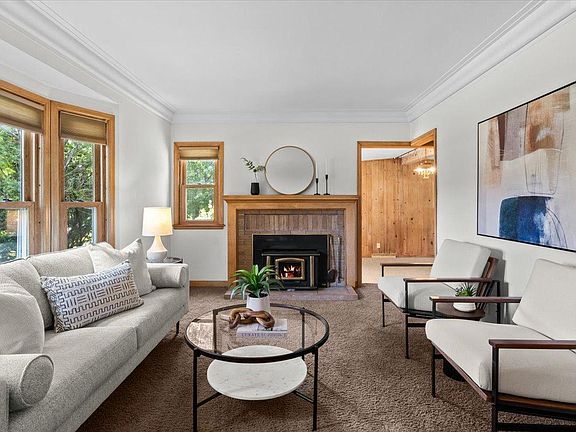 This solid home features newer windows, a 2016 roof, added insulation for improved efficiency, a newer furnace, fresh paint, and updated landscaping. Step inside to a warm and inviting layout that showcases two main-floor bedrooms, an adorable full bath with original tile, and a bright living room complete with a bay window, coved ceilings, and a cozy wood-burning fireplace.