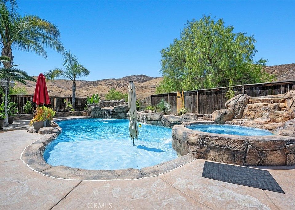 Welcome to an entertainer’s paradise nestled in a serene neighborhood with scenic mountain views. This beautifully maintained single-story residence offers the perfect blend of comfort, style, and resort-inspired outdoor living – with no HOA. This three-bedroom, two-bathroom home with a three-car garage also features a versatile fourth room, perfect for a guest bedroom, home office, playroom, or anything your heart desires. The flexible floor plan is designed to meet the needs of modern living while maintaining a warm and inviting atmosphere. Step inside to an open-concept layout filled with natural light, spacious living areas, and tasteful modern upgrades throughout. Whether you're hosting gatherings or enjoying peaceful evenings at home, this inviting design accommodates every lifestyle with ease. The showstopping backyard is a private oasis, featuring a sparkling saltwater heated pool with dual cascading waterfalls, a built-in spa, and tranquil mountain views. The expansive covered patio spans the entire length of the home, ideal for seamless indoor-outdoor living. Gather around the built-in fire pit under the stars, grill in the designated BBQ area, or unwind in the professionally landscaped yard complete with a thoughtfully designed garden path along the side. Sustainability and savings go hand in hand with solar panels and a Tesla Powerwall, offering energy-efficient living year-round. Lovingly cared for and move-in ready, this home effortlessly combines everyday comfort with luxury living—inside and out.