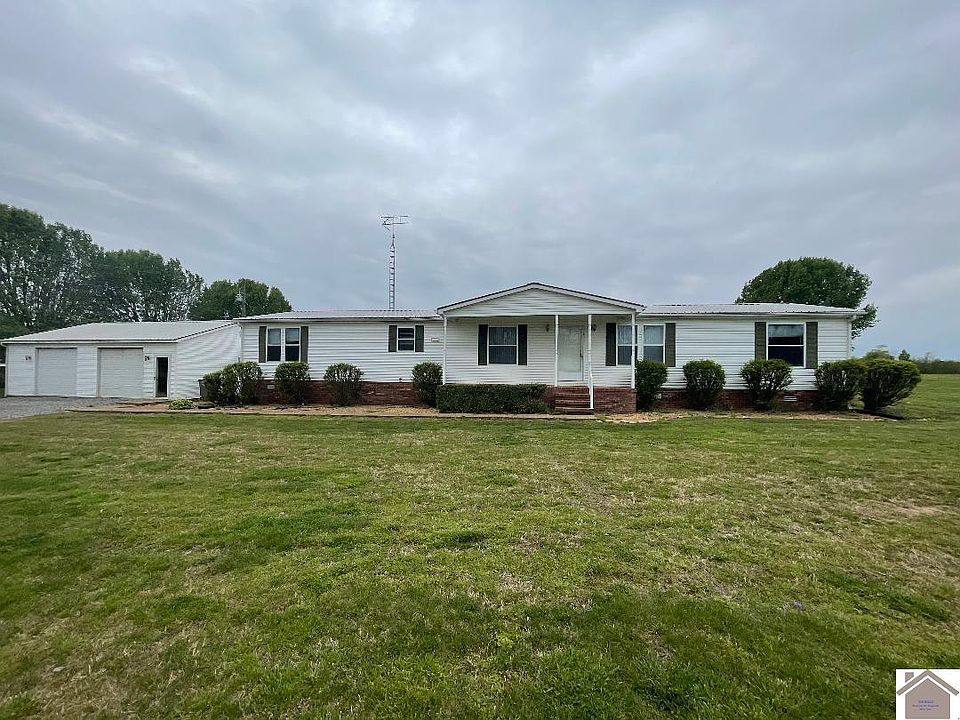 Captivating 4 bedroom, 2 bath home with office, family room, formal dining room, eat in kitchen with island bar, living room. Carpet installed on April 18th from Lowes. Flooring in hall bathroom recently installed. Den and kitchen has beautiful hardwood floors. All bedrooms have walk in closets. Master bedroom has master bath and office. Utility room opens to back concrete patio with brick foundation. Sidewalks go to front door, side of home and back to the patio. Covered front porch is concrete. Home is on brick foundation with vents. Two car garage/shop with electricity. Outbuilding. Construction on large building has been started with concrete pad and has been framed some metal is on the premises to finish out.