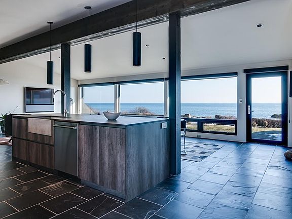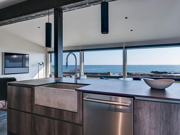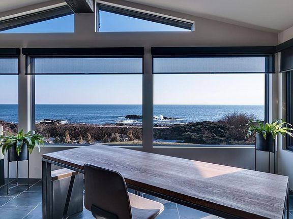 Stunning contemporary commanding prime location on Atlantic Road in desirable East Gloucester, offering panoramic views of the Atlantic and a luxurious setting for enjoying the finest in New England coastal living. Impeccably designed and constructed, this 2 bedroom, 2 full bath home was completely restored in 2017 to the highest standard. In keeping with its rugged and coveted location on Gloucester's Back Shore, the interior includes unending walls of windows in hurricane glass offering uninterrupted ocean views at every turn, slate floors with radiant heat, exposed wood beams, and a sleek ultramodern kitchen. A sprawling master bedroom boasts a floor-to-ceiling granite gas fireplace and mirrored floor-to-ceiling closets. The home's open concept floor plan favors one-level living and a sense of continuity with the seashore just beyond the front lawn. The outside features standing seam metal roof, gutters and downspouts, tall custom privacy fence and a two-car garage.