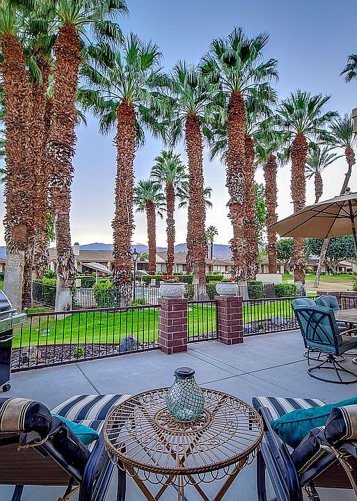 Best location in all of Monterey Country Club with the ONLY South pool directly in backyard facing South! RARE 20 MAX plan! Great location, next to COD, McCallum Theater- close to El Paseo , Westfield Mall and centrally located to Palm Springs & LaQuinta. All new appliances in 2024, new Nest smart home, new Schlage smart home lock, with other smart home features. Extended back patio with Weber propane BBQ, fenced concrete patio and extended private front courtyard with new built in gas BBQ 2015. Upgraded desert landscape front and back yards and removed driveway hump. Due to new California laws coming in the future to remove shrubs to prevent fires, my front courtyard is all concrete and easy to maintain. Added ceiling fans/lights to every room. Added extra ceiling installation where ever it was possible. Also three layers of installation with green board, TYVEK between my condo and shared neighbor wall to my kitchen walls with pictures to document. Custom Remodel “One of a kind “floor plan. Gorgeous, gourmet kitchen! Partially furnished with high end furnishings. It has the tile roof with New double-paned windows and 6 panel doors with Baldwin door handles, new custom quartz slab in kitchen and stunning dining area with built in quartz slab and mini bar! Rare, two separated primary en-suites. Primary bathroom has new Italian glass vessel double sinks, new copper fixtures, new traps with travertine tiled, luxurious spa-like primary and guest bathroom has granite with double sinks and Jack and Jill doors with tub/ shower combo. New “custom design “ kitchen cabinets with pull out drawers and handles. New stunning “ custom designed” coffee bar with quartz counter, storage and lighted top cabinets. The kitchen nook is custom made into sitting bench, new plantation shutters. Rare Santa Barbara Floor plan with 1336 sq ft. New paint outside & inside 2024 smart home features, ring cameras, etc. New fans/lights in every room & back patio. Guard gated Ted Robinson Golf Community. Call/TEXT owner at 310-922-4642 for more details! Your zen condo in paradise!