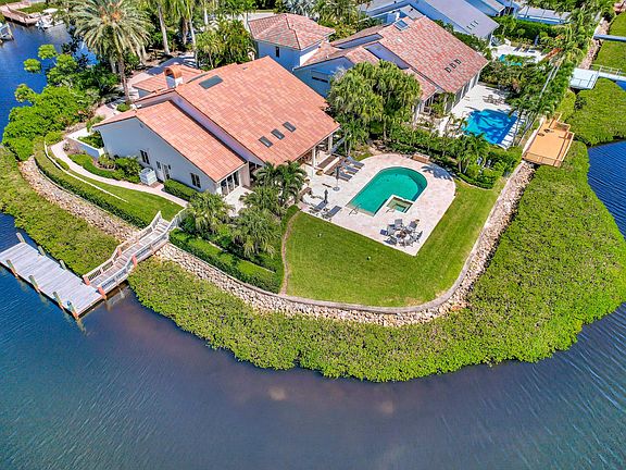 Your dream home in Admirals Cove awaits! This rare point lot offers 300 feet of waterfront with breathtaking views on three sides, including spectacular southwest sunsets. Completely and tastefully remodeled, the residence showcases a timeless transitional design with an open floor plan. Inside, you'll find four bedrooms, each with its own en suite bath, plus a powder room. Finishes include French oak wood floors with a herringbone-pattern foyer, a cathedral tongue-and-groove ceiling, a floor-to-ceiling marble fireplace, Lutron lighting, and impact windows. The gourmet kitchen features Carrara marble countertops, JennAir appliances, double ovens, a six-burner gas cooktop, and a wine cooler. Enjoy the serene outdoor living areas in total privacy from your pool, spa, and multiple seating... areas across nearly a half-acre of lush grounds. The lot can accommodate a boat up to 60 feet, offering easy access to the Intracoastal with no fixed bridges. This exceptional property also offers opportunity for expansion.