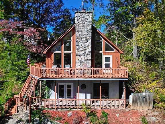 A-Frame with year-round Lake Junaluska & long-range mountain views. Soaring vaulted ceilings and a floor-to-cathedral-ceiling stacked stone gas fireplace anchor a wall of windows that flood the main level with light and panoramic views. Enjoy a wraparound deck, primary suite, kitchen + laundry on main. The lower level has a full apartment with its own kitchen, laundry, bath, living room, bonus room, and private entrance—ideal for multigenerational living or guests (buyer to verify rental/STR rules). Updates per seller: new roof 2020, new heat pump with gas backup in 2017, new water line from meter, stairlift, jacuzzi tub in primary. Bonus workshop with private entry and small animal enclosure. Walking trails nearby and access to Lake Junaluska amenities. Superb location: ~10–15 min Maggie Valley, ~5–10 min Waynesville, ~25–30 min Cherokee & Smokies, ~30–35 min Asheville, ~15–20 min Blue Ridge Pkwy, ~25 min Cataloochee.