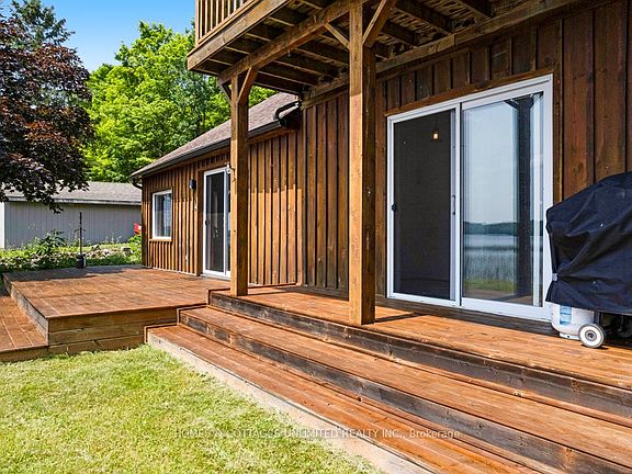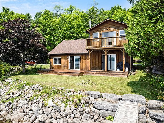 Nestled on the tranquil north shore of Dalhousie Lake, this well-maintained, partially furnished home or cottage is move-in ready just in time for summer memories. Featuring 3 spacious bedrooms (2 up, 1 down) and 2 full bathrooms, there's plenty of room for family and guests to relax in comfort. The oversized primary bedroom offers its own private balcony with stunning lake view perfect for morning coffee or quiet reflection. The open-concept main floor showcases a vaulted ceiling, warm pine flooring, and a cozy woodstove for those cooler evenings. The bright kitchen seamlessly connects to the dining and living areas, with patio doors leading to a generous lakeside deck ideal for entertaining or simply enjoying the peaceful surroundings. Convenience is key with a large main floor bath that includes laundry. The insulated garage/workshop features patio doors that open to the water's edge, offering versatile use of space. A charming bunkie tucked away at the back of the property provides a great guest hideaway or personal retreat. The shoreline is shallow with a solid bottom perfect for swimming and there's room to anchor your boat just offshore. Inside, natural light fills every room through abundant windows, creating a bright and cheerful atmosphere that brings the outdoors in. This delightful property is truly a pleasure to show full of charm, comfort, and lakeside appeal. Don't miss your chance to make it yours!