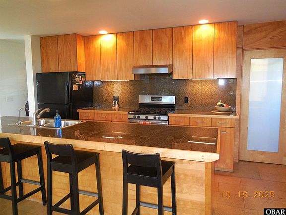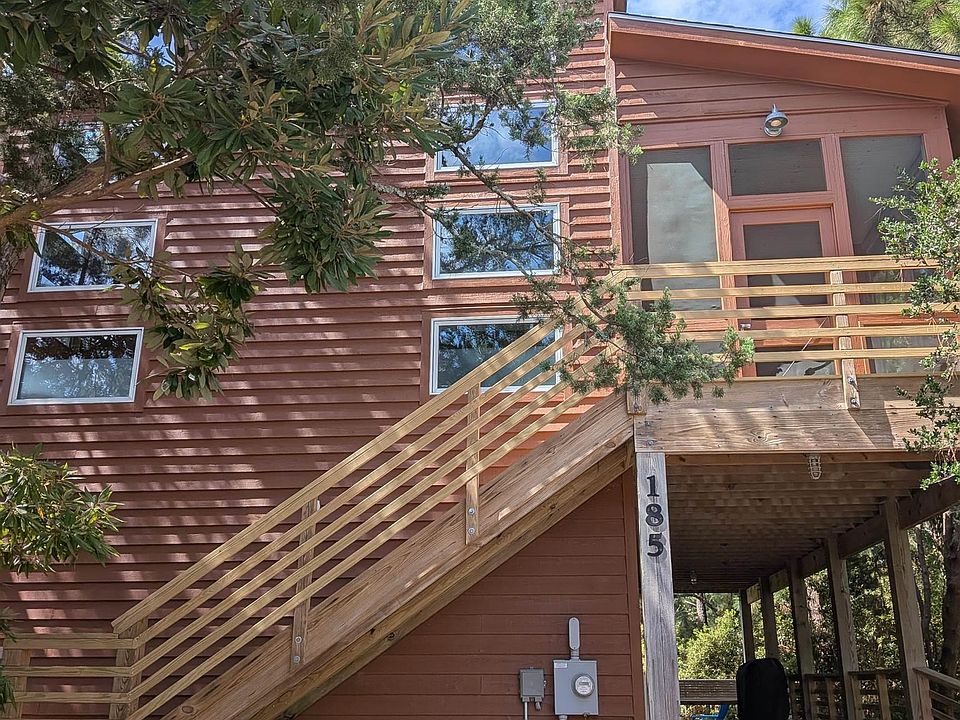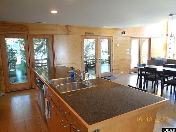 A 4 bedroom/3.5 bath home built in 2005; a coastal contemporary beauty! Built and designed by two of Ocracoke's finest craftspeople/artisans. From window and door size and placement to building the home among the tall pines to enjoy the summer breeze and privacy, it would be hard to find a home that takes better advantage of the island's natural beauty! This custom home has many different possibilities for various floor plans. A 4 bedroom home or a 3 bedroom home with a one bedroom/1 bath first level "in-law studio" or use the current temperature controlled storage area together with the studio for a full "in-law" apartment. Another option is to keep one area locked off for owner use and rent the other space as a vacation rental. Currently, the first level consists of a 20' x 16' storage area/work space and a studio apartment. The studio has an efficiency style kitchen and attached bath with a shower. The studio is large enough for a sleeping space and a living area. If there is no one using the first level, both the storage area and studio are conveniently heated and cooled by P-Tac units for separate climate control from the main home. Swing your day away on the large covered deck that extends the entire length of the home. The deck can be accessed by both the storage area and the studio. The second level is perfect for entertaining with its spacious open living/dining/kitchen area with attached furnished grand screened porch. On those beautiful Ocracoke evenings, bring the outside in, when you open the (3) 6' wide French doors to the screened porch! The custom kitchen has birch wood cabinets, gas cook stove and granite countertops. The living area has cathedral ceilings, birch walls, unique window design to bring in the natural light, creative lighting, a wall that can transform into a climbing rock wall (if desired) and cork flooring throughout. There is also a half bath and a laundry/utility room with a locked storage closet, W/D, shelving and office area. The third level consists of 3 bedrooms and 2 baths. The primary bedroom has high ceilings, ceiling fan, built-in custom closet with shelving and drawers and an attached bath with a beautiful hand troweled concrete shower with a skylight above and a tiled floor. The remaining 2 bedrooms each have built-in shelving, a birch wood wall panel that has an option to open to view the living area below, cork floors and high ceilings. One bedroom has a custom industrial ladder attached to the wall to access an additional sleeping loft/reading nook. A hallway bath has tiled floors, tiled tub/shower surround and a skylight above the tub. Updates include: central heat /ac (HVAC new in 2021), newly painted exterior in 2024, a new roof in 2022 and a new hot water heater in 2024. Currently being used as a primary home; however, it has been a vacation rental in the past with an impressive rental history.