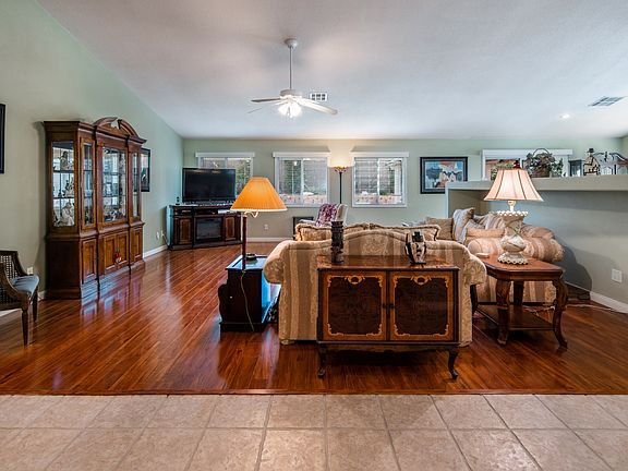 Comfortable open-concept layout is open and bright with natural light pouring in. Kitchen treated to sleek white cabinetry and a mega island topped with corian counters. Upgrades include stone pattern tile with new grout, hardwood laminate, decorator paint, modern blinds, ceiling fans, and new master windows. Yard is ideal for relaxing or entertaining thanks to the spa, covered patio, mist system, sun shades, fire-pit, and specialty lighting.