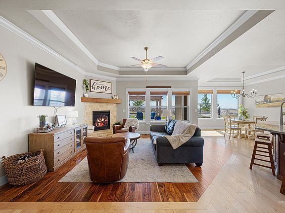 Welcome HOME to your very own sprawling estate 15 minutes from Boise in the up-and-coming community of Mayfield. This beautiful single level home sits on over 11.5 acres of rolling topography and tucked less than 2 miles off the I-84 exit. Enjoy your panoramic sunrises and sets from the shaded pergola on the large back patio or relaxing in the hot tub. This home has 2 large primary suites with walk in closets or for use as a private guest retreat with the split bedroom plan. Beautiful new shower in the NE suite. The tray ceilings and tall doors draw your gaze up and there's a large open living area for gathering around the fireplace. The kitchen has ample counter space with the large island, a desk nook and a big walk-in pantry for plenty of storage. High quality water filtration system included. The large, insulated shop can hold at least 3 more vehicles with room left for a hobbies, additional gathering space, storage or farm supplies. RV parking on the side slab and additional covered parking out front with a wraparound driveway. Bring your green thumb and enjoy the raised garden beds, orchard and new sprinkler system. Imagine your horses, goats, chickens and hobby farm dreams. This property has been meticulously maintained.
