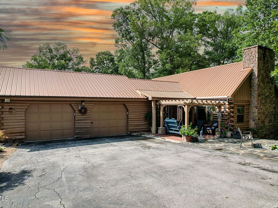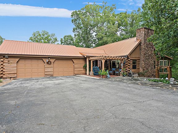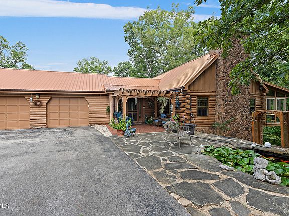New to the Market: Freshly Stained! Fresh Asphalt black top. A nature's retreat between 4.47 acres, private asphalt lined entrance to the secluded sanctuary. This log constructed abode features a flag stone front entrance topped with a new pergola. Sit on the blue porch swing and listen to the tranquil waters of the KOI pond with some of the fish being 17 years old. The side yard features a Gazebo with dock to a 30 ft. deep pond surrounded with cattails and stocked with bass, crappie, blue gill and catfish. Along the back side of the property, there is a heated above ground pool (has its own heat pump) and decking that goes around backside of the garage and another entrance. The seller thoughtfully had ramps installed for ease of getting to the poolside as well as a patio picnic table. Skylights offers the perfect touch for a night swim or relaxation. A fire-pit laden with pea-gravel is also located at the back of the house and enough split wood to last you a good amount of time. This property also has a detached workshop/barn equipped with 200-amp electric service, two stables if you have a horse or two and ample space for a few chickens if desired. This area of the property would be great if you were a gardener! Upon entering the home, the seller currently uses the front room as her dining room. There are doors that lead to the exterior pool area from this room and to the right you'll enter the vaulted ceiling living room with a stone fireplace extending to the ceiling. This fireplace is a black cast iron glazed unit that burns from top down and comes equipped with a stainless-steel pipe insert. Skylights let the natural light beam in from various areas. The living room extends to the glassed-in sunroom where you can enjoy wildlife and nature views year-round. (Framed stained glass is negotiable). The main living floors are a handsome hand scraped Brazilian cherry. On the main floor, you'll also find a complete kitchen with all appliances remaining, granite countertop, custom cabinetry and an apron sink. The laundry room is spacious and convenient to primary bathroom with a tiled walk-in shower. The bedroom is adjacent to the bath and has a walk-in closet. Downstairs is perfect for guests as you have a separate den with copious amounts of storage and built-ins and private enough to have a tenant/in-law suite as there is an exterior door. The guests will love having their own bedroom, bathroom, dinette, washer/dryer hookup and patio. Upon landing upstairs, it holds another bedroom, storage closet and full bathroom and office area. This property is truly amazing and so peaceful.