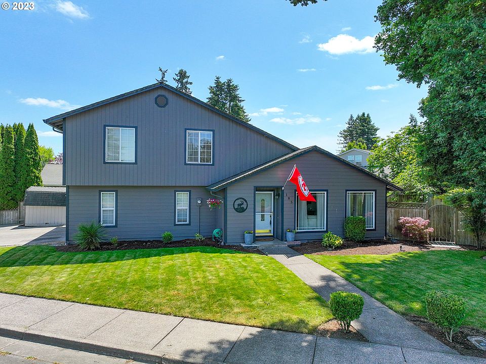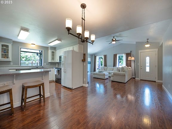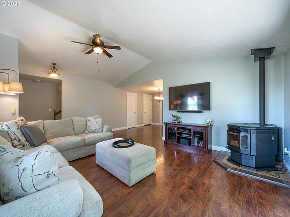 OPEN: Saturday 6/17 1:00-4:00. Nothing left to be desired with this move-in ready home. It's nestled in a quiet neighborhood and is situated on a .14 acre corner lot with views across to the back fields of Junction City High School. A true entertainer's delight with an open floor plan living large with vaulted ceilings boasting natural light. Upstairs you will find a primary suite and the additional 2 bedrooms and full bathroom with plenty of storage. Double French doors from the living room open to a large fenced backyard and patio with a water feature, fire pit and tool shed. A slider from the dining area opens to a covered porch with tile flooring for year round use. Enjoy the offerings of the neighborhood near a community park, paved paths and view of the high school. Updates include: new interior & exterior paint, updated bathrooms, new furnace, heat-pump, dishwasher.