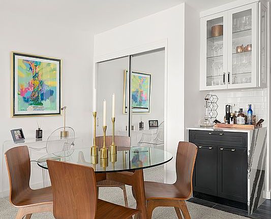 Upon entering, you are immediately greeted by the open, airy vistas and refined finishes that define this residence. The expansive living room easily accommodates a dining area, creating an inviting space for both relaxed evenings and stylish entertaining. The thoughtfully designed kitchen is outfitted with stainless steel appliances, including a full-size double-door refrigerator, dishwasher, and microwave. Custom cabinetry with leather-and-bronze pulls, a bronze faucet, and marble waterfall countertops elevate the space with a touch of modern elegance.