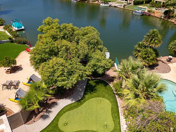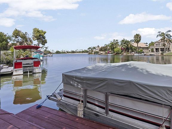 Incredible Single Level Waterfront Executive Beauty! Gorgeous HUGE Kitchen, Extended 3 car garage plus over $140,000 in recent updates and upgrades. Split Master plan, 3 full Baths! There is a huge bonus room-office right off the impressive entry hall and 2 secondary bedrooms and 2nd bath split on opposite side of home. There is also a 3rd bath with huge shower across from the office/bonus room. Lots of windows overlook lake & the 2 year new pool and putting green that lead to the boat dock with access to the amazing Val Vista Lakes main lake so you can boat to the clubhouse from this home! The incredible hot tub is part of resort backyard w/2 covered patios on huge north/south lot on corner of CDS. Clubhouse, Pickleball & Tennis, Pools, Workout & Seller offering help with closing costs.