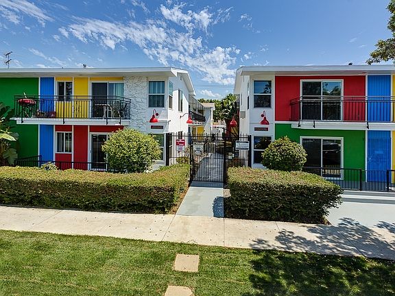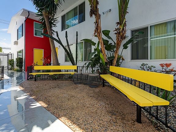 The building has been overhauled with a Mondrian inspired exterior with pops of Yellow, Blue, Green and Red. These colors are present throughout the property and accentuate all the features. The bright red gooseneck lights lead you to the common courtyard into the yellow benches and through the drought tolerant garden areas.
