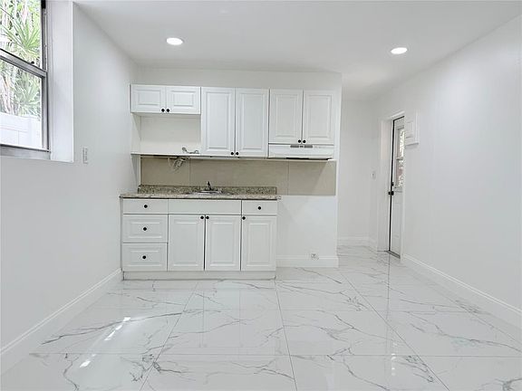 This sleek and modern studio apartment offers the perfect blend of comfort and convenience. Featuring stunning porcelain marble-look tile floors throughout, the space is bright, airy, and move-in ready. The open-concept layout includes a compact kitchen with granite countertops and white cabinetry, perfect for easy meal prep.