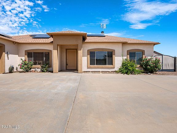 Beautiful 4 Bed, 3 Bath, well maintained home on just under an acre. There is so much to love about this home. Spacious, split bedroom floor plan with living room, family room and formal dining room. Kitchen has ceiling high cabinets and Granite counter tops. Newer, energy efficient microwave and frig. Massive living room with a cozy wood burning fireplace. The quiet patio is a great place to entertain with an entrance to a restroom right from your patio. Large garden area is already planted and the greenhouse is an awesome bonus! FRESH VEGGIES ARE READY TO PICK! Leased solar has approx 10 years remaining on the lease. Roof was replaced in April 2020. Shared well. Lots of privacy and only 10 minutes from Prescott Valley. The best part...NO HOA!