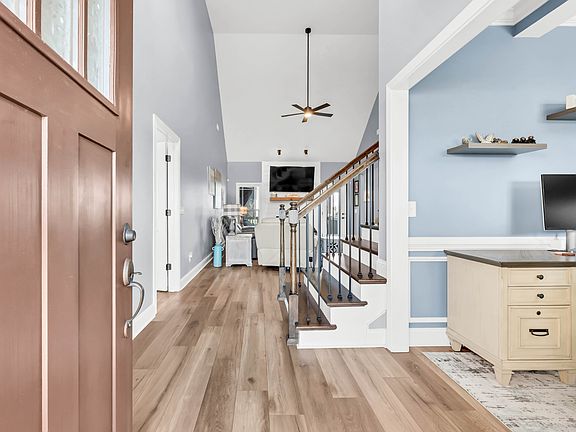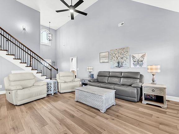 Welcome to Wellington Fields, where space, style, and comfort come together in this beautifully designed 4-bedroom, 3-bath home offering 2,800 square feet of thoughtfully planned living. With 2 bedrooms and 2 full baths on the main level, this layout works for a wide range of needs. Step inside to a bright, open floor plan highlighted by tall ceilings and wide-plank light flooring. The living room features a striking shiplap fireplace and flows seamlessly into the dining area and kitchen. The kitchen stands out with ceiling-height white cabinetry, granite countertops, stainless steel appliances, a herringbone backsplash and a large island with apron-front sink and built-in electrical—perfect for cooking, gathering, and everyday living. A formal room with coffered ceilings and wainscoting offers the ideal flex space for an office or additional entertaining. The main-level primary suite feels like a retreat with its double tray ceiling, turret-style sitting area, and a spacious en-suite complete with dual vanities, a separate tub and shower, tile flooring, and a vaulted ceiling. A second main-level bedroom and full bath add convenience for guests or additional family members. Upstairs features two more bedrooms, a full bath with granite vanity, and a generous bonus room offering even more flexibility. Outdoor living shines with a saltwater pool featuring a waterfall, brick surround, deck jets, and built-in seating areas below the water line. The covered patio includes a mounted TV, making it a perfect space for relaxing or entertaining. The fully fenced, level backyard also includes a storage building. Additional features include a dedicated laundry room with cabinetry and utility sink, a two-car garage with opener, extended driveway, city water and public sewer, central electric HVAC with ceiling fans, and a full suite of stainless steel appliances. Zoned for Kirkwood Elementary, Middle, and High School.